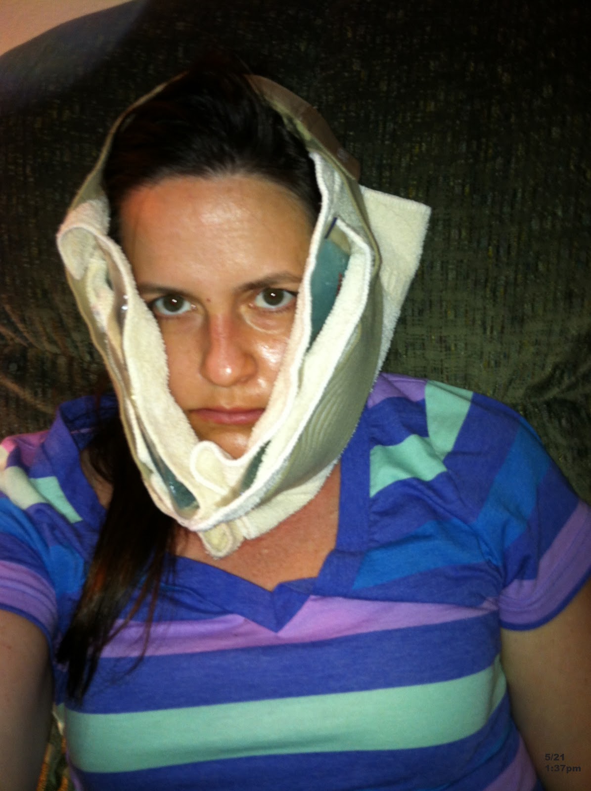 one of the first things i did was take a shower. i only was in the hospital for 29.5 hours from the time we checked in to the time i rolled out in the wheelchair. but i just wanted to wash off the hospital, for lack of a better phrase. man, that felt good. of course i didn't wash my face really. i just gently wiped it a washcloth. i couldn't feel anything around my cheeks and chin. but man when i barely touched my lower nose/upper lip area i wanted to cry a little. that was not pleasant. it's an odd feeling. you are numb and swollen but can still feel pain. there is no way to completely explain it. washing my hair was a little weird too. all the crazy pressure that was going on in my mouth and the blood that was coming out of my nose made it odd to lean my head back into the water. needless to say, it was a long shower.